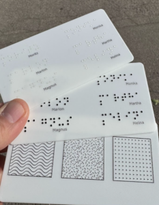 Auch Brailleschrift habe ich mit rund 20 Blinden Menschen erprobt. Alle waren sehr zufrieden mit der Qualität. Das tollte ist, dass die Brailleschrift transparent gedruckt werden kann und so an die gleiche Stelle positioniert werden kann wie die darunter gedruckte Schwarzschrift.