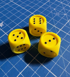 Bislang drucke ich Brailleschrift in der Regel separat und klebe diese auf die Spielbretter auf. Ebenso besteht ein Würfel aktuell aus dem Würfelkörper und 6 Plättchen mit den jeweiligen Würfelaugen, welche aufgeklebt und nachbearbeitet werden müssen. Hier soll der Eufy in den Prozess eingebunden werden und diese Dinge direkt auf das 3D-Modell aufdrucken. Die ersten Tests waren sehr vielversprechend.