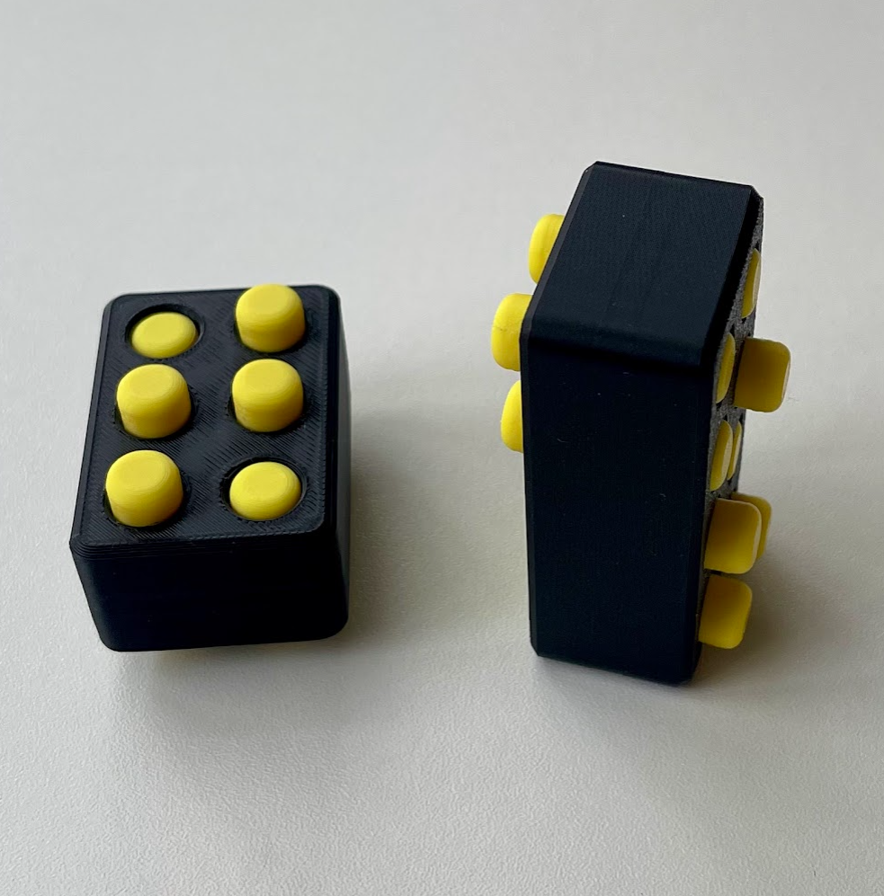 Als letzter Punkt wird das Braille Cell Toy auch gerne als Fidget-Spiel genutzt, also zum Bewegen der Finger, um das Gehirn wach zu halten; ähnlich dem Klicken eines Kugelschreibers. Allerdings ist immer ein deutlicher Klick hörbar.